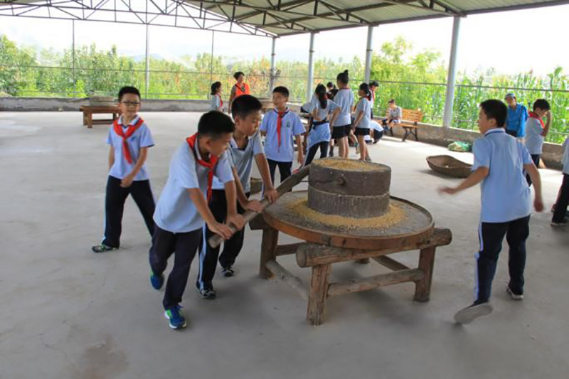 石磨起源于新石器时代。据战国《世本·作篇》记载,春秋战国之际的公输般(即鲁班)发明了旋转型石磨,使粮食加工变得容易多了。1968年,在河北满城汉墓中出土了一架距今约2100年的石磨,这是我国迄今所发现的最早的石磨。石磨是用于把米、麦、豆等粮食加工成粉、浆的一种机械。开始用人力或畜力,到了晋代,中国劳动人民发明用水作动力的水磨。通过推石磨加工玉米的过程,体会劳动的艰辛,要做出劳动成果,需要有顽强的意志和毅力,培养学生热爱劳动,享受劳动成果的快乐,锻炼学生独立、自信、情感和意志等思想品质。