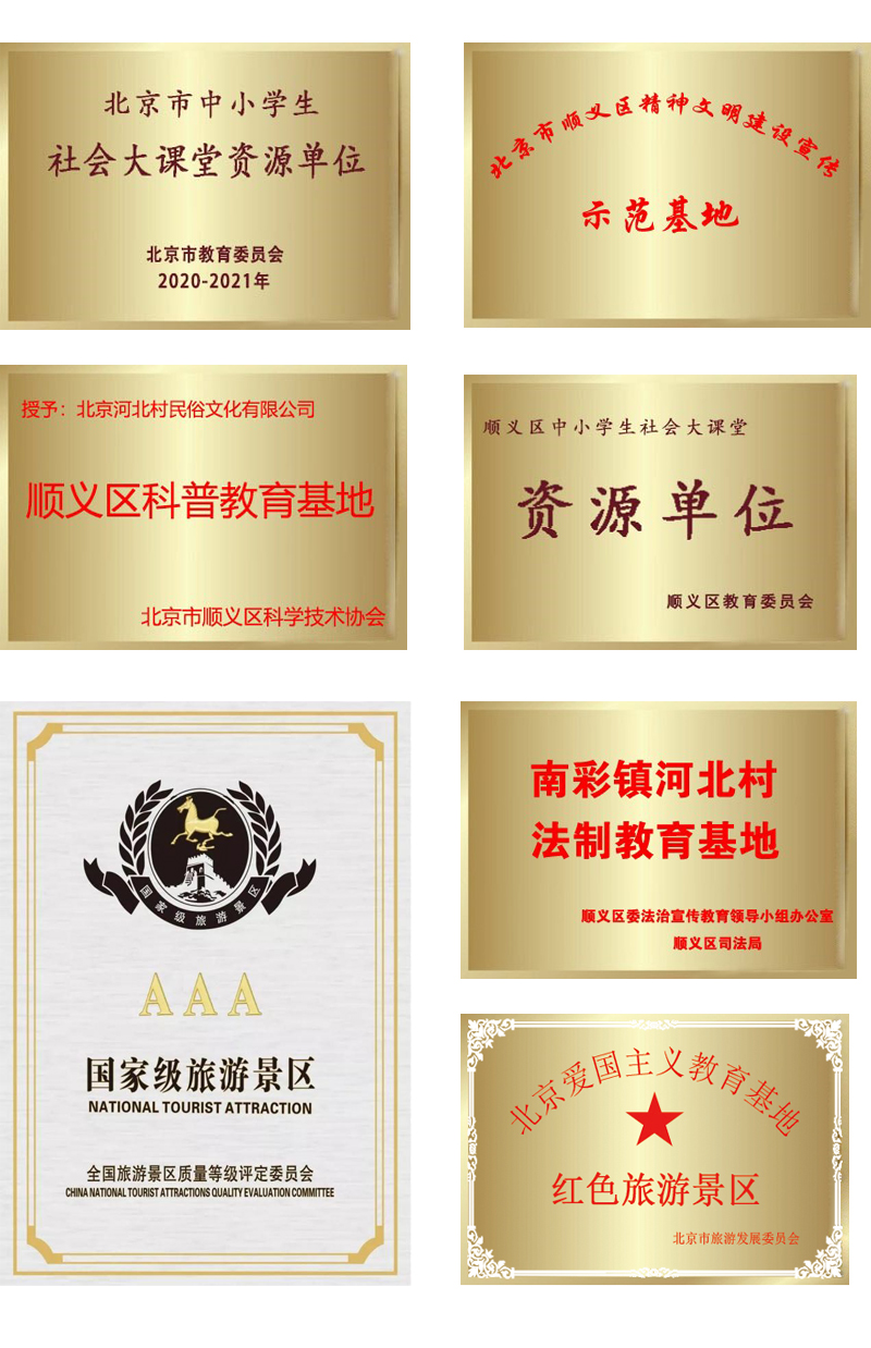 河北村民俗园坐落于美丽的潮白河畔,是北京市中小学生社会大课堂资源单位、北京市爱国主义教育基地、国家3A级旅游景区。是以“传承民俗文化、弘扬民族精神”为主题的寓教于乐文化休闲场所。
